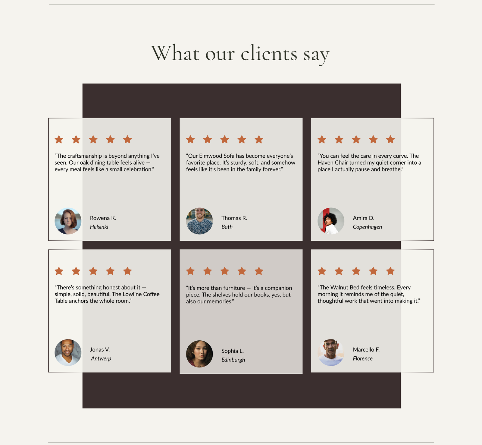 We designed a sleek, modern website that functions as a digital business card, a calm, curated environment where every piece of furniture can be appreciated visually and conceptually. Airy layouts, soft earthy pastels and generous white space highlight textures, materials and design details without distraction. We created an online environment that is minimalistic, sensory-rich, and professional yet inviting.