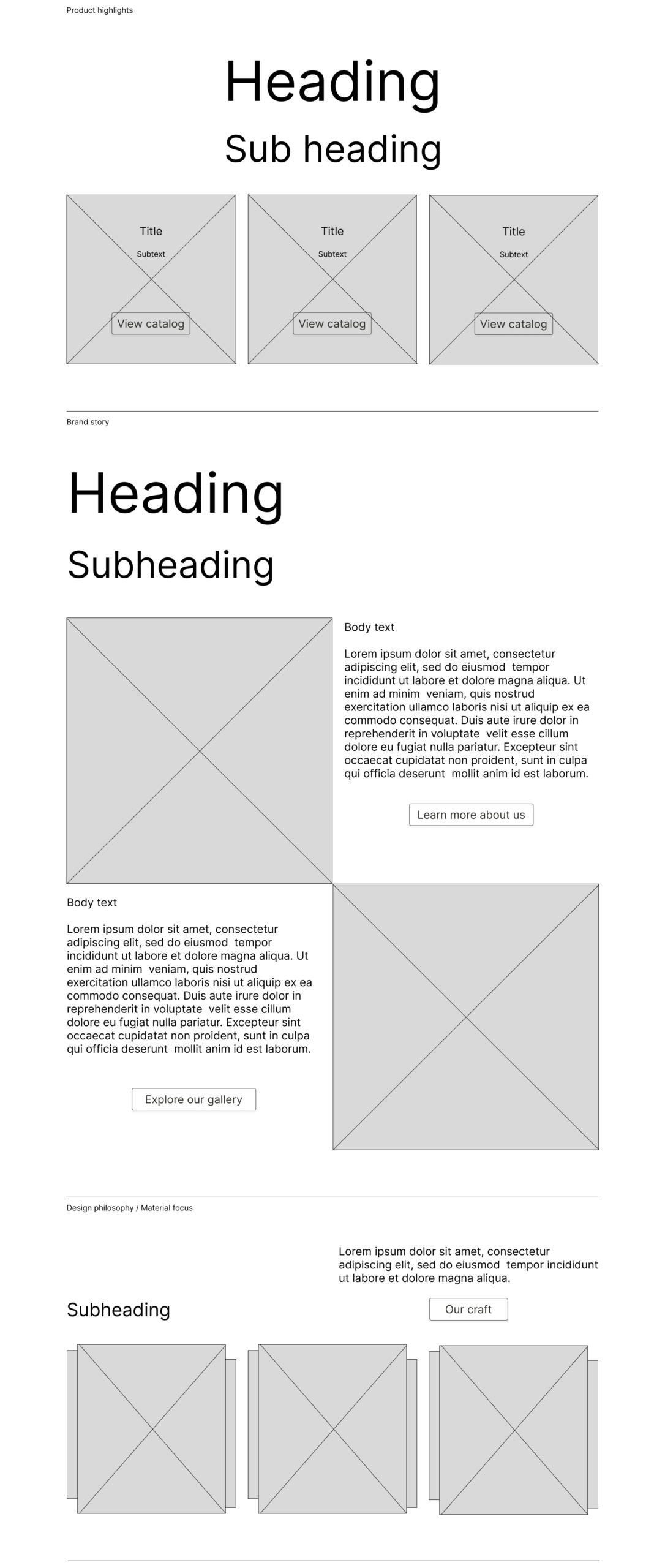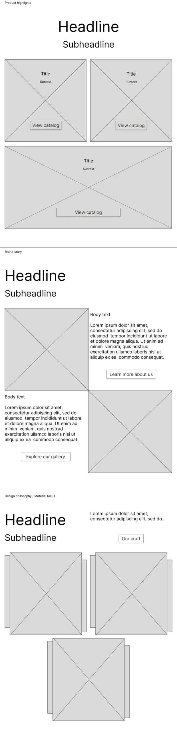 A comparison showing how the information architecture and UX decisions shape the low-fidelity wireframes, and how these foundations evolve into high-fidelity interfaces. Each section demonstrates how the same design principles translate across devices, preserving clarity, elegance and tactile emphasis at every screen size.