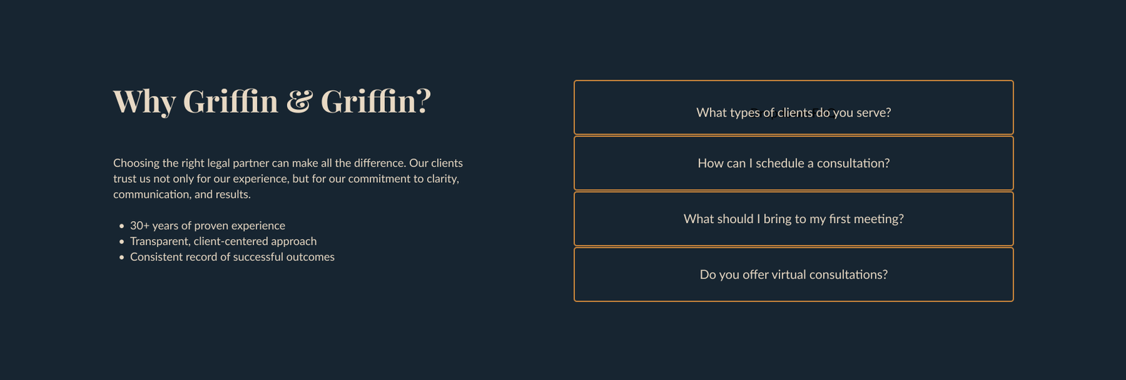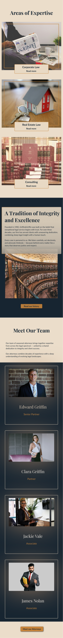 Griffin & Griffin fictional law firm had no prior website, leaving clients with no central way to explore services, meet attorneys, or understand their practice areas. The challenge was to create a digital identity that communicates trust, structure and professionalism while reflecting the firm’s heritage, but without feeling outdated.