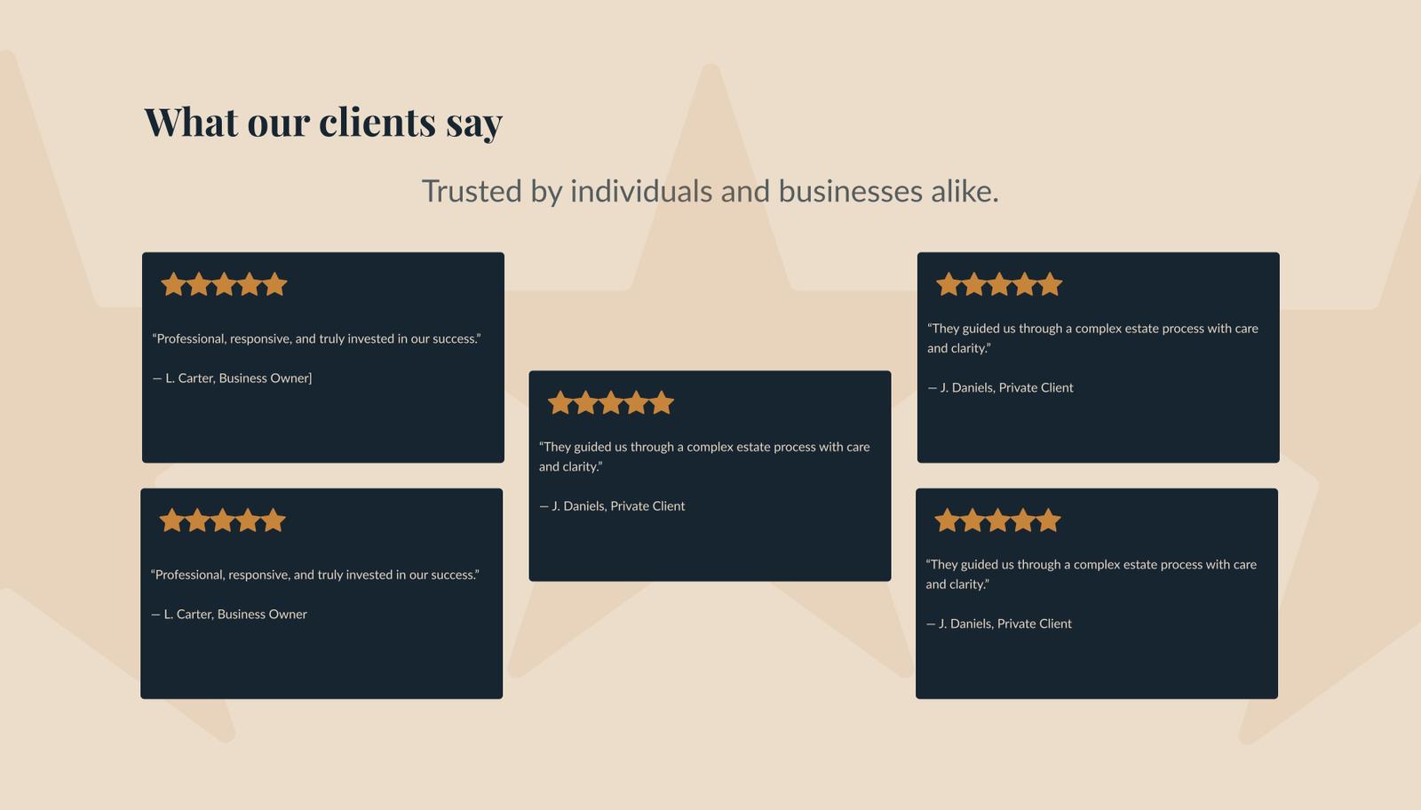 Visual storytelling is expressed through composition. Overlapping text and imagery introduce depth and movement, while lawyer profiles are presented with gallery-like framing, subtly referencing legacy, reputation and longevity. Deep navy tones evoke the precision of a “pressed suit in court”. The layout remains disciplined and predictable, creating a sense of stability that is essential for first-time visitors seeking reassurance.